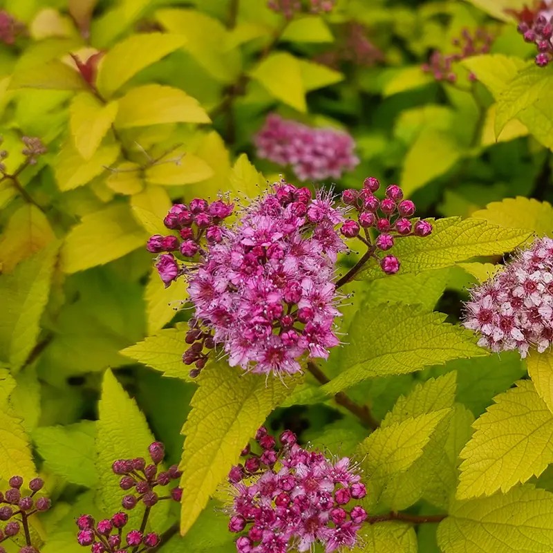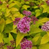 Au printemps, le feuillage de Merlo® Gold est d'une intensité remarquable, mixant jeunes pousses rouge feu et petites feuilles jaune citron. En été, le feuillage reste jaune. Son port est naturellement arrondi et régulier. En juin, Merlo® Gold se couvre d'une multitude de petites fleurs rose foncé. La suppression des premiers corymbes fanés favorise la remontée à fleurs. Résistance à l'oïdium, cette nouvelle spirée se mixera à merveille dans les massifs avec d'autres arbustes ou des vivaces à feuillage coloré.