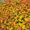 Un jeune feuillage rouge orangé puis vert jaune en été accompagné d'une intense floraison rose foncé