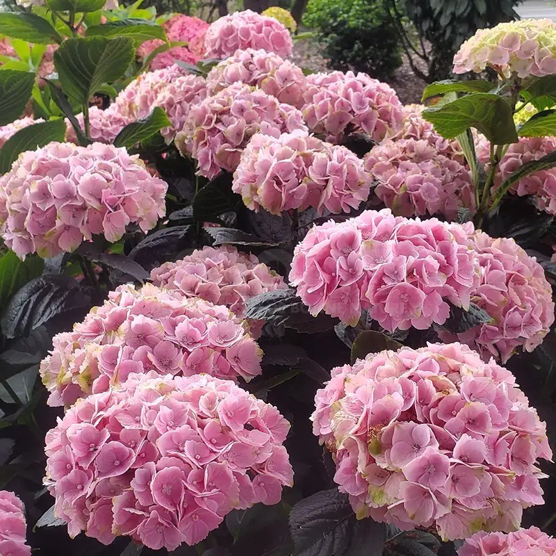 La floraison rose tendre (ou bleu tendre en sol acide) vire au vert à l'automne.