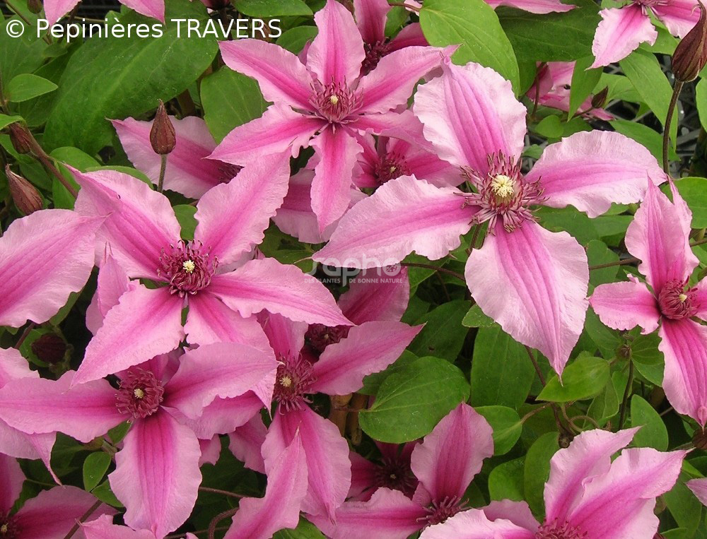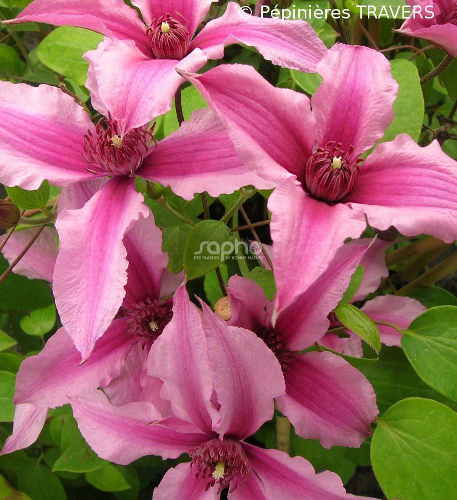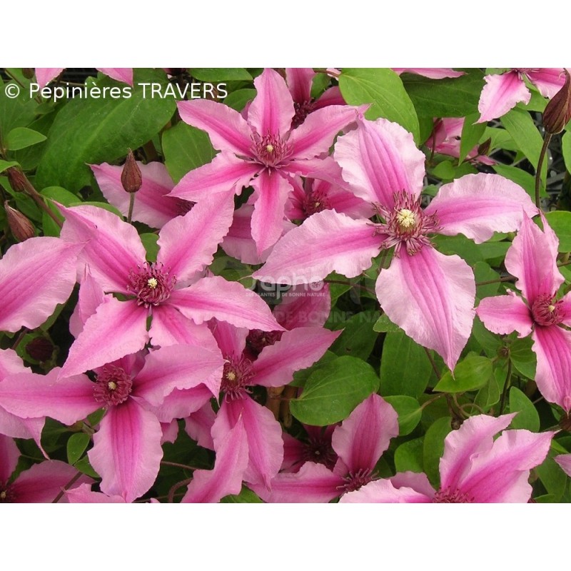 In June, the plant is covered in two-tone stars of more than 10 cm in diameter; the petals are pink, the centre of the flower, fuchsia. The stamens are also deep pink. A second, slightly less abundant flowering follows in September. This duo of pink blends perfectly with vivacious plants or low shrubs.