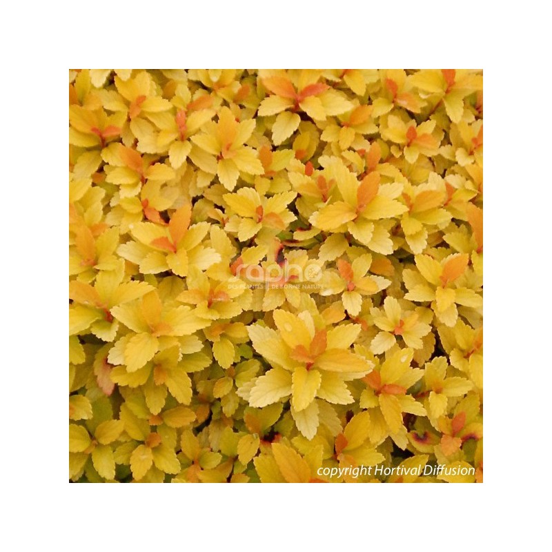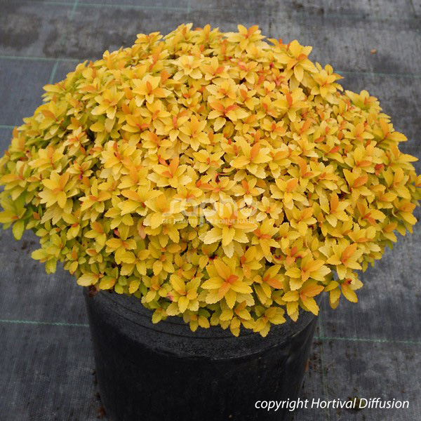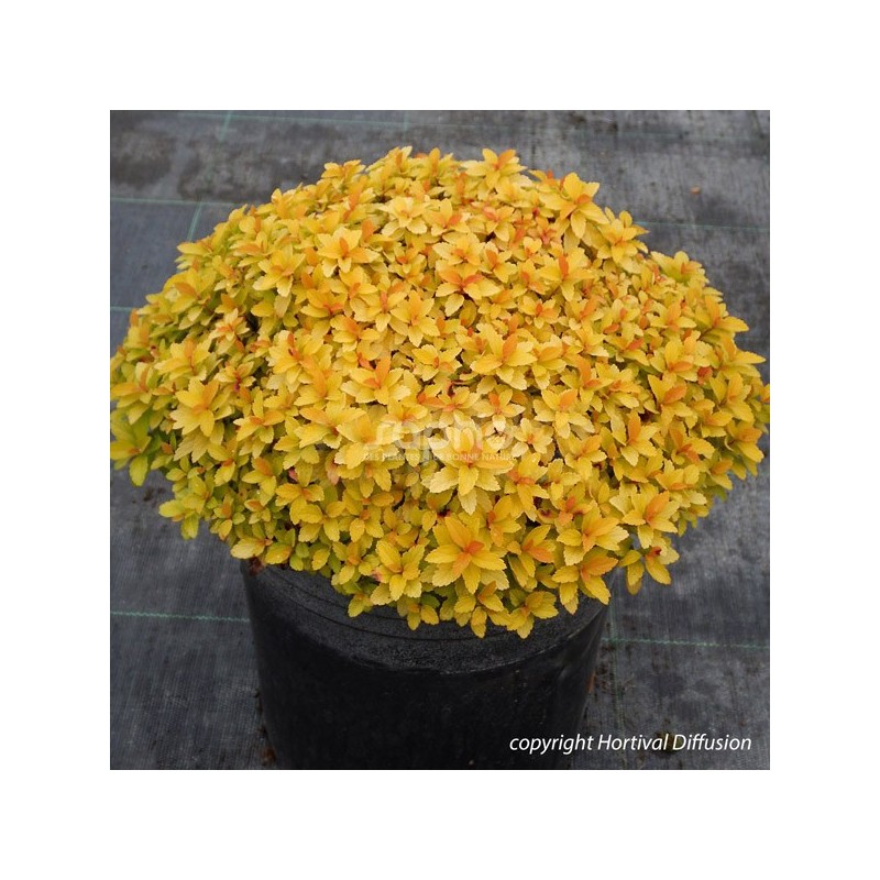 The Spiraea japonica Zen'Spirit® Gold is a shrub of limited development and highly compact habit. In spring, its foliage is a beautiful luminous gold that persists throughout the summer. Freely branching with a delicate wood, this Spiraea forms a dense and colourful, spreading cushion. The flowers are very discrete. It's a plant that's appreciated above all for its foliage and its decorative form adapted to small spaces, borders or pots.
