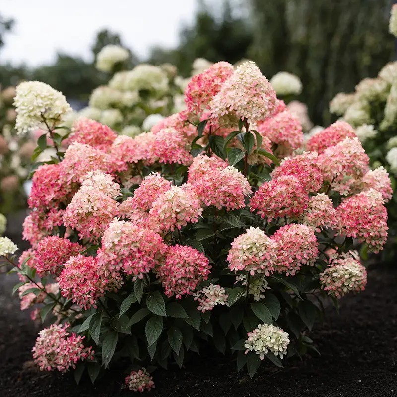 A small, panicle hydrangea with a profusion of flowers that quickly change to deep pink