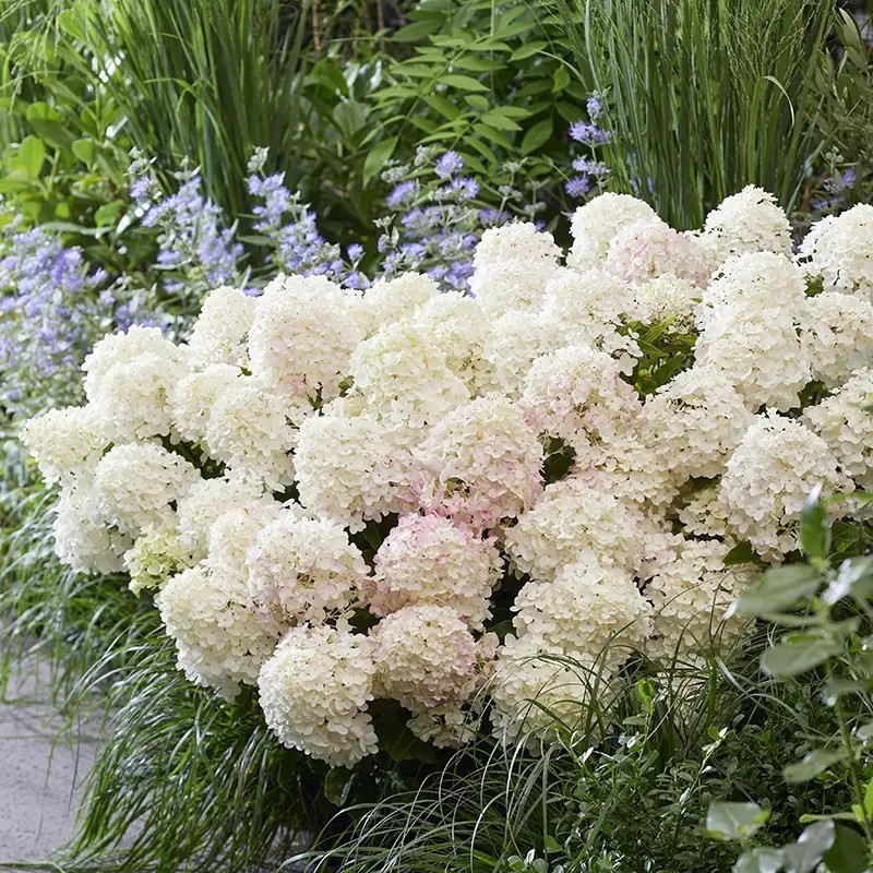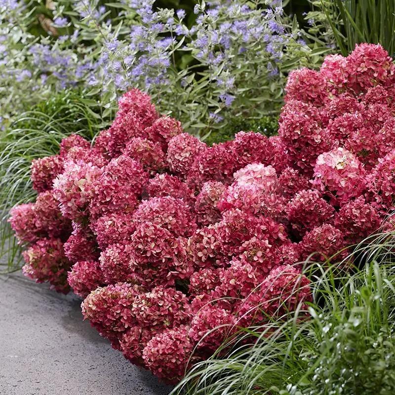 A small, panicle hydrangea with a profusion of flowers that quickly change to deep pink