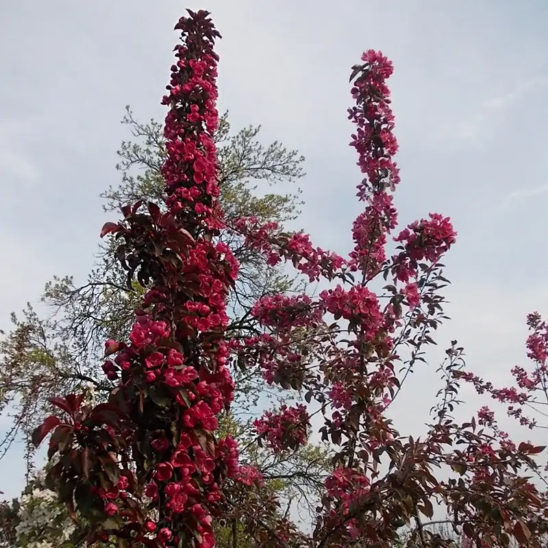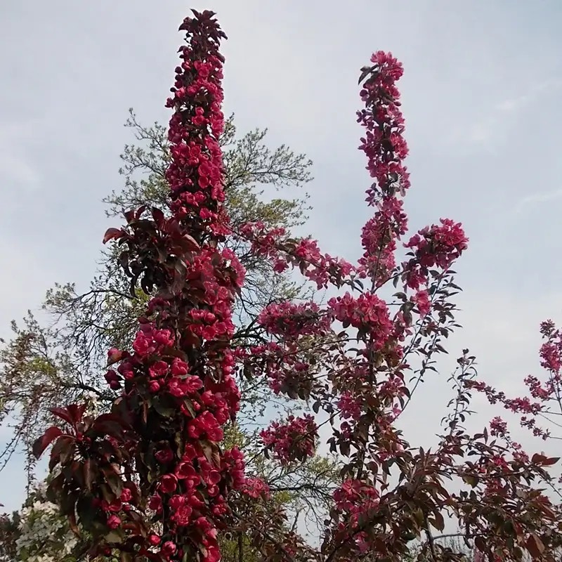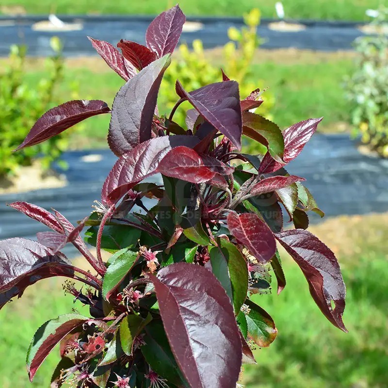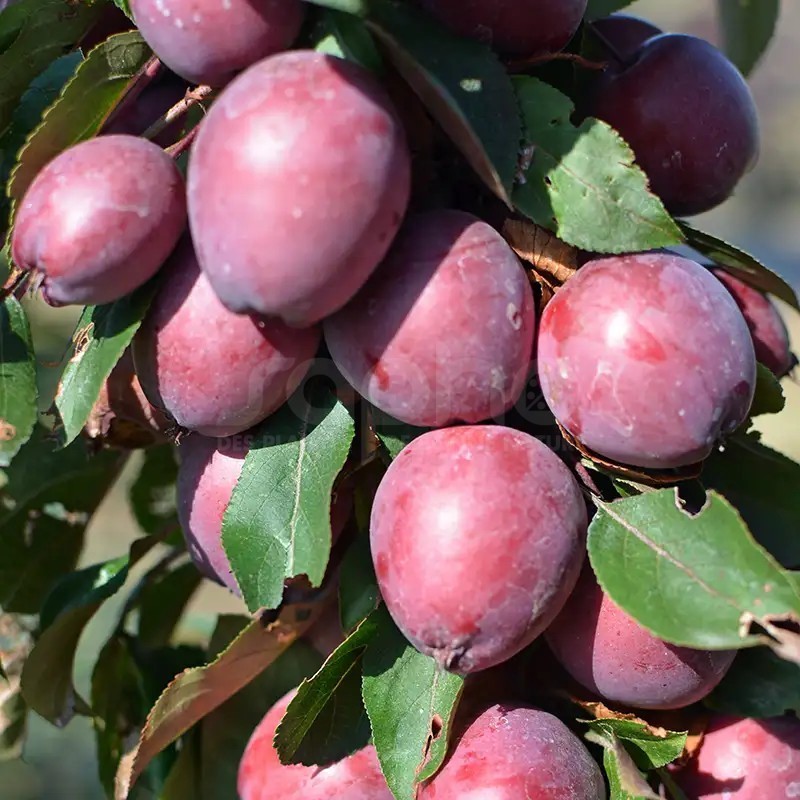 - Numerous plum-sized, purplish-red fruits with red flesh persist until late autumn